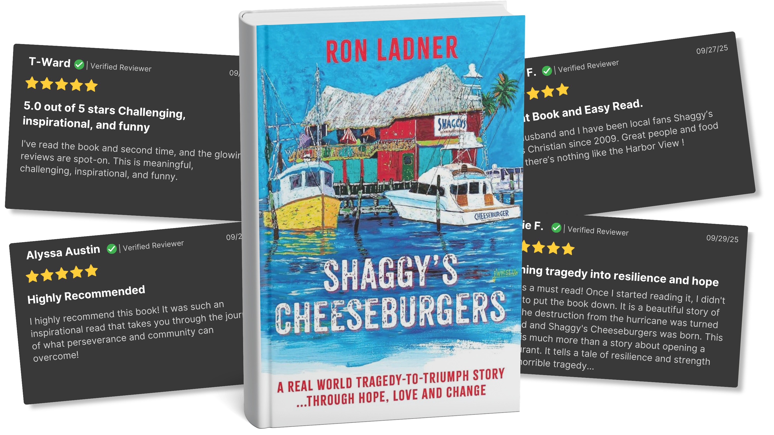 Ron Ladner takes you on his personal journey, shaped by disasters, sculpted by persistence and built on a damn good cheeseburger. It is a lesson in history, resiliency, and leadership. It’s raw and honest, dragging the reader through life’s natural and man-made disasters. It’s peppered with rescues and recovery, followed by love and loss. You’ll see names of places and people you know, or wish you’d met. Ladner introduces you to a girl named Laura, a boat captain named Rimmer, a bunch of rescue dogs, a few orphaned elephants. He takes you along as he develops five waterfront restaurants with a make ‘em happy vibe, cutting-edge technology, and a quest to value employees. He invests all he has—personally, emotionally, and financially—in his community, family, and Shaggy’s. He wins. He loses. He fishes. He keeps the faith. It’s all here